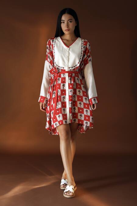Red shirt dress with dolman sleeves, all-over prints, embroidered front yoke with piping details.