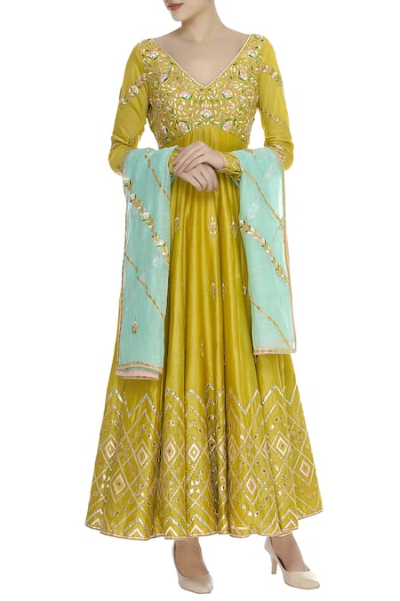 A mustard yellow chanderi anarkali kurta is accentuated with gota, zari & resham embroidery all over. Paired with contrast blue embroidered dupatta.
