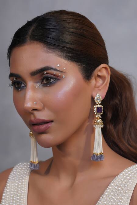 Gold long jhumkis featuring carved purple stone at the center with beaded pearl tassels