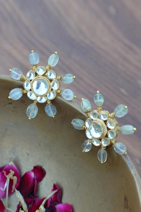 Gold and green shell pearl stud earrings featuring oversized design with arrow-like rays embellished with sea-green quartz stone rays around the polki tops