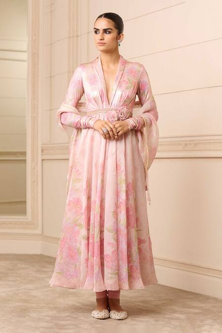 Mauve and pink floral hand-painted Anarkali featuring a plunging V-neckline and embroidered waistband with 3D flowers. Paired with a stretch net churidar and a floral print scarf with bead drops.