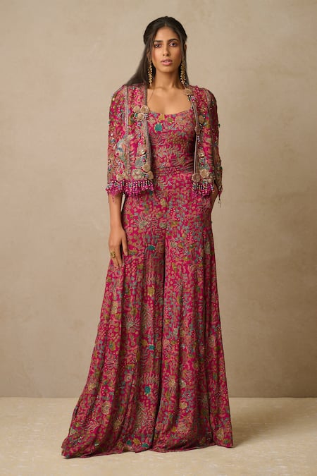 Multicolor floral embroidered jumpsuit featuring zardozi and aari work. Paired with a tassel hem gilet made of silk dupion, complete with side pockets.