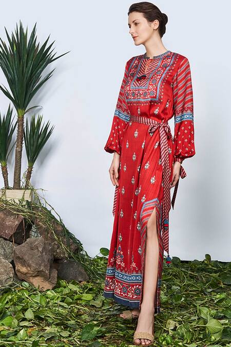 The luxurious red Tashi Kaftan is reminiscent of royal inner chambers from the Far East. This long chic kaftan comes with the fabric belt.