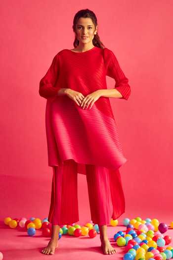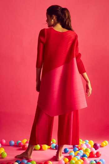 Pink colorblock tunic with pleats all-over and asymmetrical hem. Comes with co-ordinating flared pants.