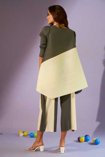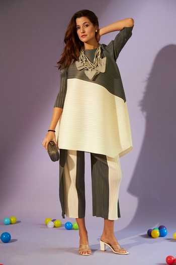 Black, grey colorblock tunic with pleats all-over and asymmetrical hem. Comes with co-ordinating flared pants.
