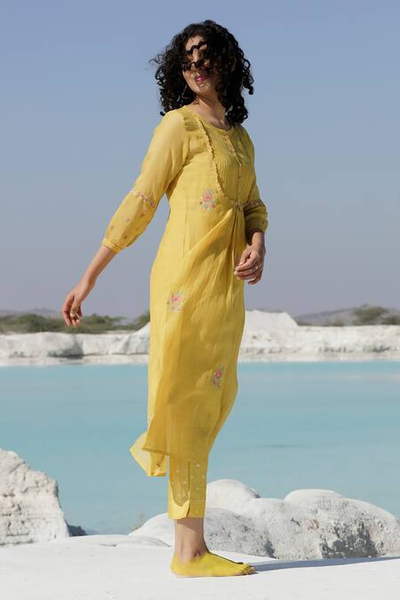 Buy_Tatwa_Yellow Handloom Cotton, Viscose, Silk Chanderi Pintuck Kurta And Pant Set_Online_at_Aza_Fashions