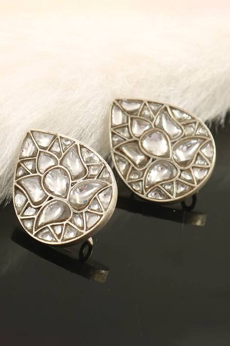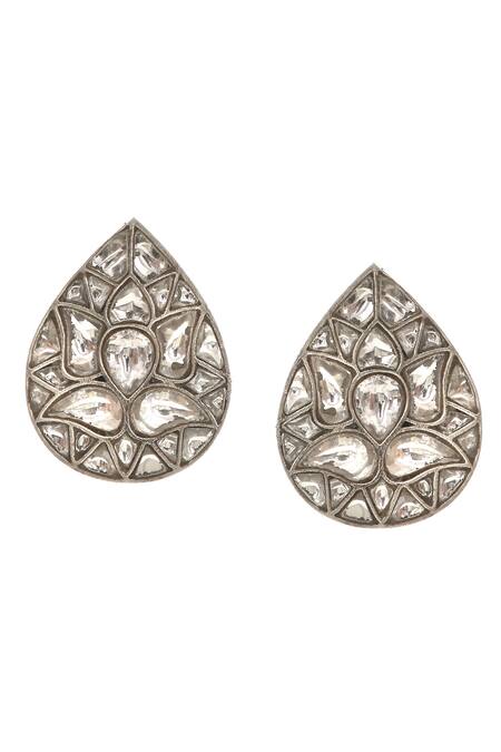 92.5 sterling silver stud earrings in tear drop design with white kundan jadau embellishment.