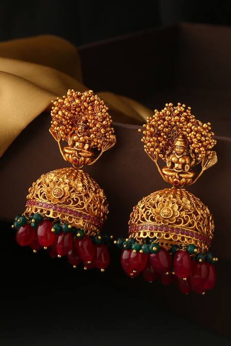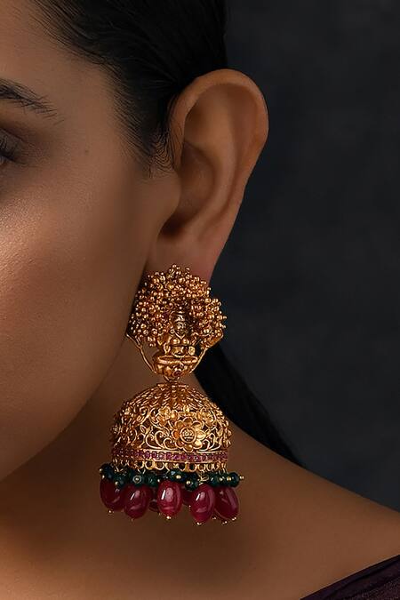 24k gold-plated jhumkas with 3D carvings, embossed detail & multi-color stone drops.