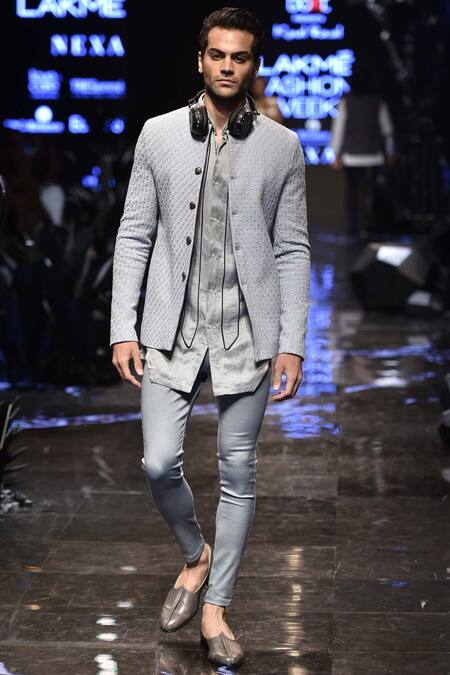 Blue tinted grey shirt kurta with textured bandhgala and pants.