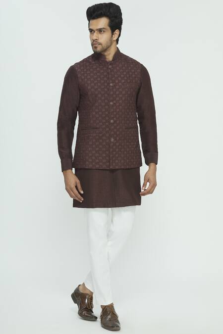 Brown bundi with textured motifs & welt pockets. Comes with plain brown kurta & white trousers.