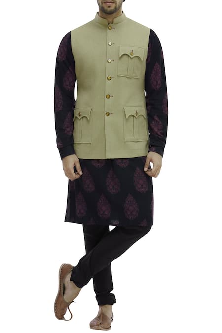 Buy_Gaurav katta_Beige Cotton Textured Bundi_Online_at_Aza_Fashions