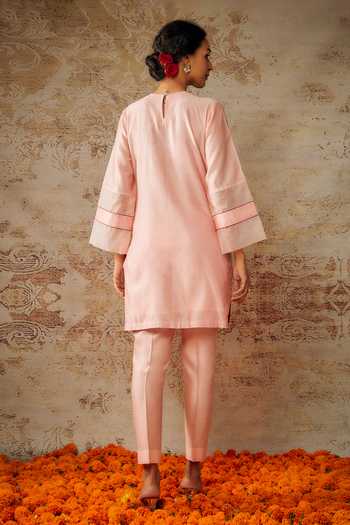 Peach Viscose, Chanderi, Organza Embroidery Round Neck Zardozi Kurta Pant Set