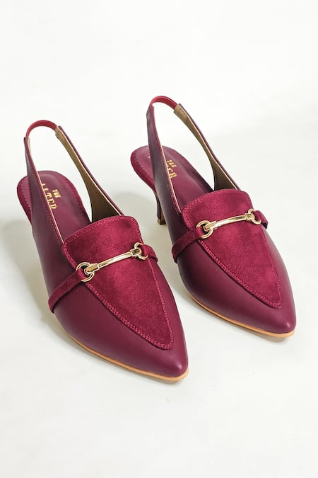 Maroon sling-back stilettos featuring buckle strap detailing in golden shade