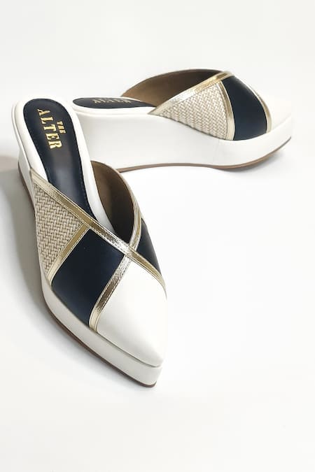 Color block detailing in gold and black shades, Crafted from vegan faux leather, 2.5 inch heel height