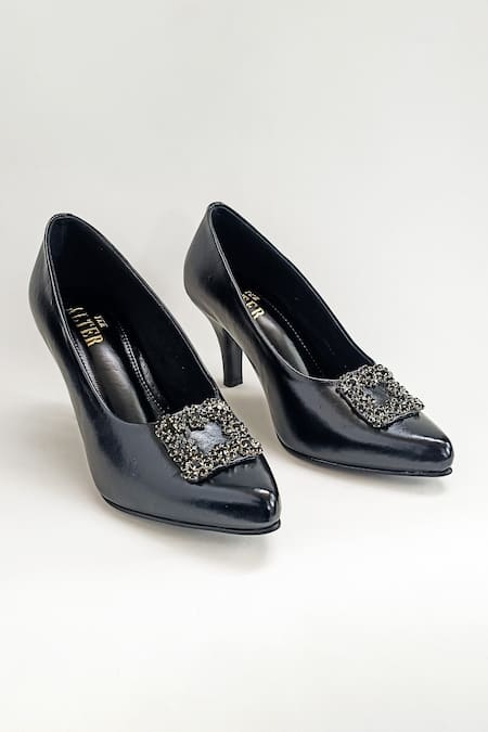 Black faux leather heels featuring a pointed front and a stone embellished buckle