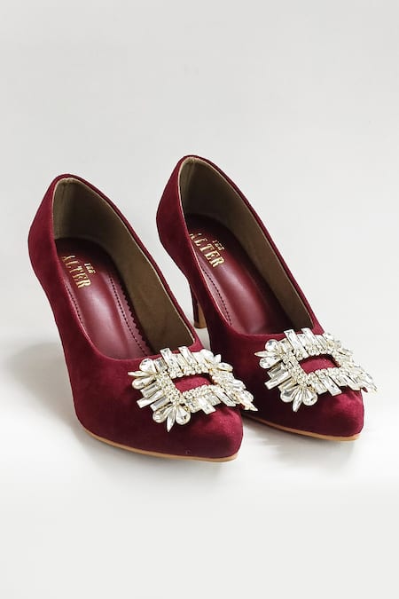 Maroon stiletto heels featuring rhinestone embellishments and a pointed toe design