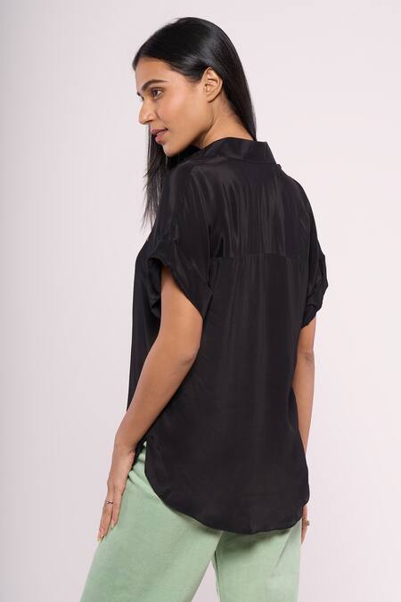 Black shirt featuring a spread collar and short sleeves, crafted from pure crepe