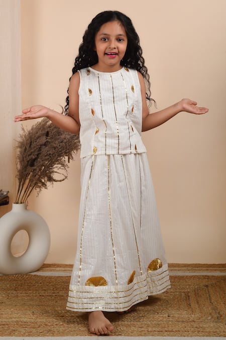 White lehenga featuring gota work and an elasticated waistband. Paired with a sleeveless blouse designed with gota details and a back keyhole opening.