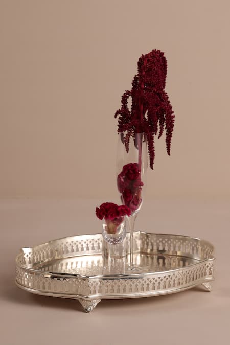 Silver floral pattern victorian curve tray crafted in brass material.