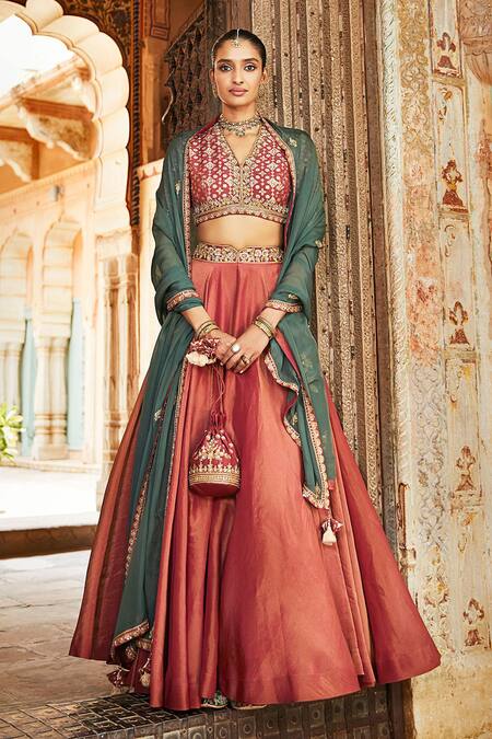 Rust tissue lehenga aari & antique zardozi embroidered waistband. Comes with blouse with mughal florals, nakshi & Kasab embroidered blouse & organza green dupatta. Paired with potli bag.