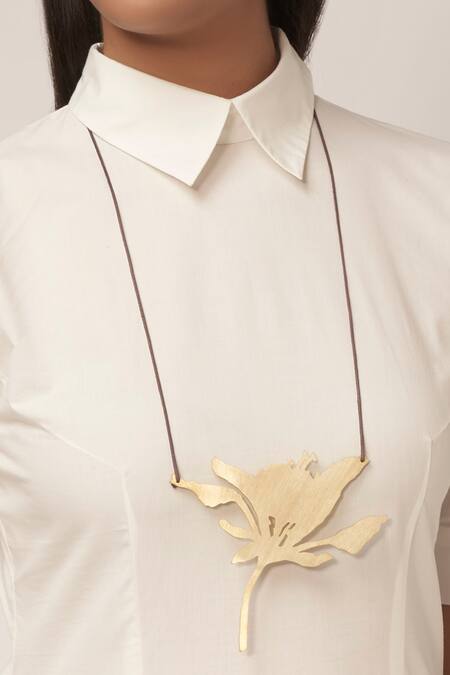 Gold-tone long necklace with floral shaped pendant & thread string.