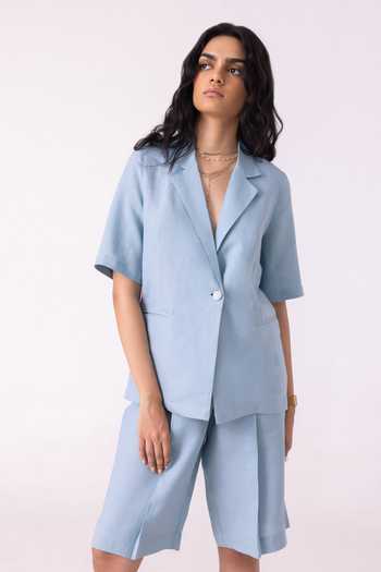 Blue linen jacket with a notch collar, short sleeves, welt pockets and a single hand-embroidered button fastening. The embroidered button is a quiet signature detail.