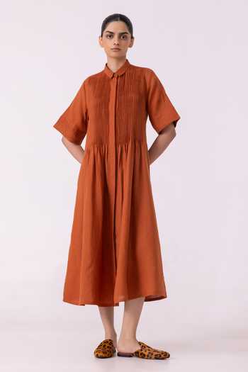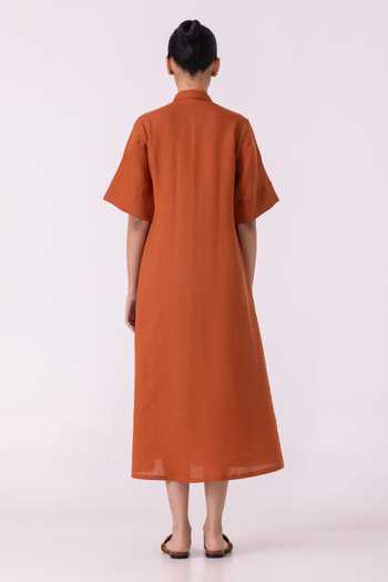 Orange Linen Collared Minerva Rust Shirt Dress