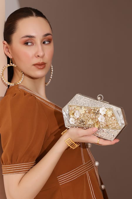 Silver handcrafted oblong octagon clutch featuring sequins, beaded & cutdana embellishments