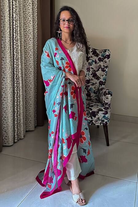Sea green silk blend dupatta featuring a vibrant floral print