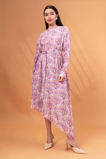 Purple and mustard asymmetric hem dress featuring all over floral mandala prints
