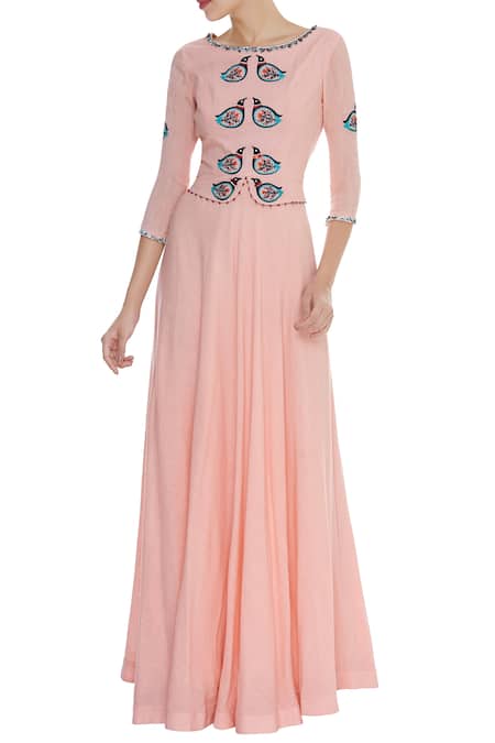 This pink hued maxi features duck thread embroidery on the yoke, sleeves and back. The colorful bead and sequin embroidery adds a dash of whimsical vibes to this relaxing, chic ensemble.