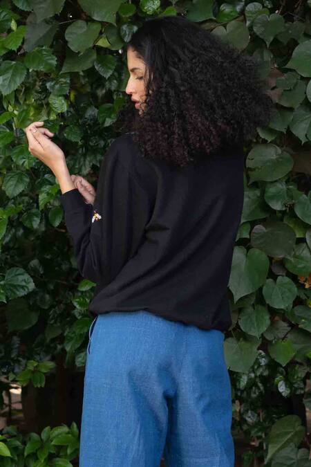 Black sweatshirt featuring delicate floral hand embroidery with thread work and full sleeves