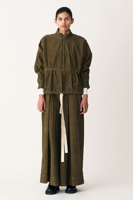 Forest green corduroy top featuring drop shoulder sleeves and front zip closure