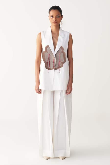 Buy_Three_White Poplin Applique Open Neck Floral Patch Fringe Waistcoat And Pant Set _Online_at_Aza_Fashions