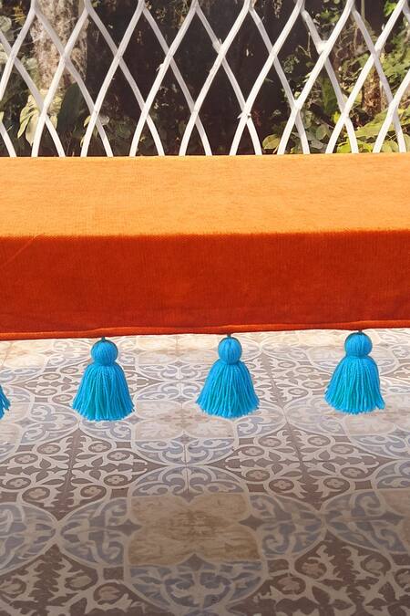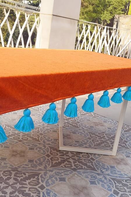 Orange rectangular-shaped table cover with blue tassel detail at the hems.