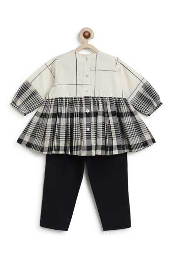 Cream top set featuring a softly flared contrast-panel top with pleats and an easy back opening. Paired with smart straight-fit black pants in 100% cotton for effortless everyday wear.