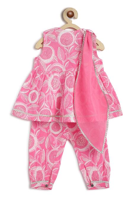 Pink floral kurta set featuring a sleeveless kurta, matching salwar, and a lightweight dupatta. Crafted from 100% cotton with a viscose dupatta, it ensures comfort and style.