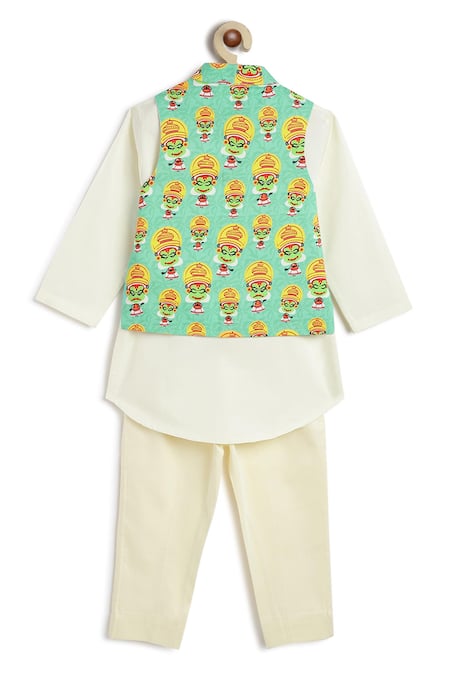 Green bundi jacket featuring original Kathakali print. Paired with a cream kurta and matching pants.