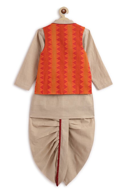 Orange reversible bundi featuring chevron and stripe patterns, paired with a kurta with embroidery and full sleeves. Comes with a contrast hem detail dhoti pant.