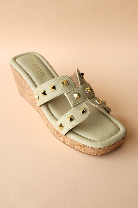 Buy_Tic Tac Toe Footwear_Green Studs Embellished Cut Out Wedges_Online_at_Aza_Fashions