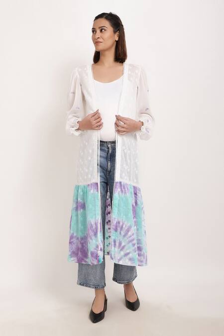White Cotton Tie Dye And Embroidery Thread Open Hem Shrug