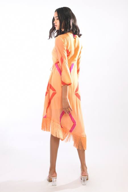 Orange Silk Tie Dye V Neck Tassel Detailing Dress