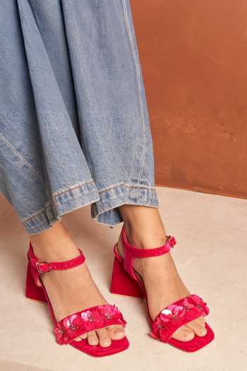 Pink block heels with layered 3D floral embellishments and subtle pearl detailing, offering a modern square open toe design. Designed for festive occasions and evening wear, they provide stable support with a block heel and ankle strap.