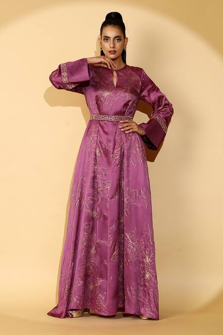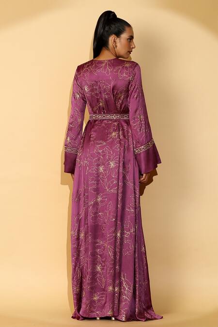 Plum kaftan with gold floral print & zari embroidered sleeve hem.