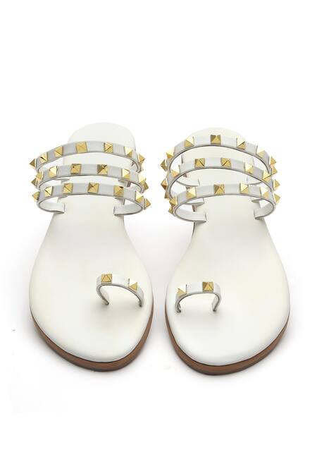 White leather flat sandals with triple straps studded with golden pyramid studs.
