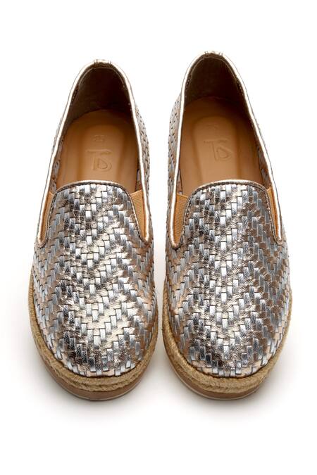 Golden & silver metallic leather plimsols in basket weave textured base.