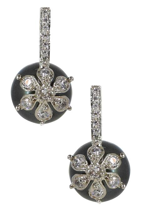 Black freshwater pearl earrings featuring a floral motif embellished with faux diamonds. Designed in a contemporary style with mixed metal composition.