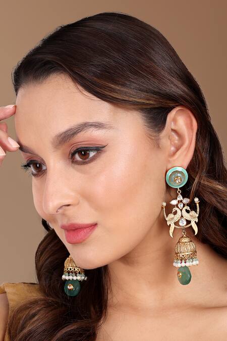 Multi color jhumki earrings featuring carved peacock motifs and blue enamel details