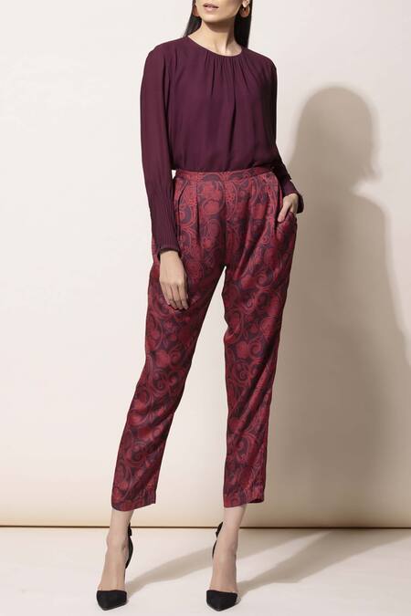 Burgundy blouse with gathers & pintuck sleeves. Comes with printed pants.