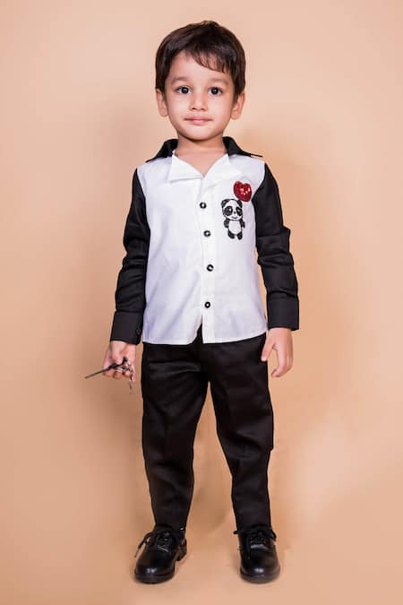 White cotton shirt featuring panda placement embroidery on the bodice and contrast sleeves
